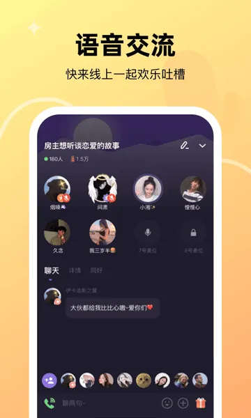 4. 便捷的社交互动:能实时在线聊天,随缘匹配同好,主动发起连麦有机会遇到声音好听的人,聊得来还能互相比心加好友,好友间开放更多功能。