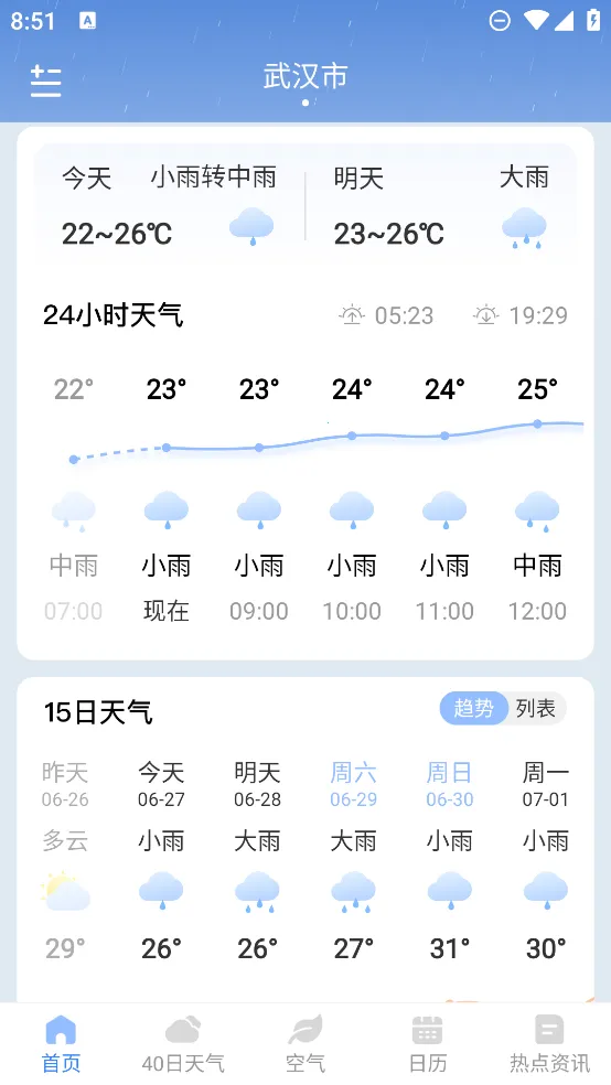 想精准查询今日起15天的天气情况?今日天气APP就能满足你!它提供了快速、详细的天气信息,包括最近七天的天气情况、气温、湿度、生活指数等。在天气预报板块,能查看实时温度、风力、湿度、降水及未来多日的天气变化趋势图。空气质量页面详细展示多项污染物的实时浓度与等级,并附有出行与防护建议。它还整合了养生知识与传统黄历,养生知识专栏依据季节推送饮食、作息及运动等方面的科普文章,日历查询功能提供公历农历对照,标注传统节日、节气及黄历宜忌。天气数据更新及时,能提供短时预报与中长期趋势预测,满足不同出行规划需求。无需复杂操作就能在首页纵览核心信息,显著降低了各年龄段用户的学习与使用成本。有了它,轻松掌握天气动态,提前做好生活决策,从容应对各种天气。
