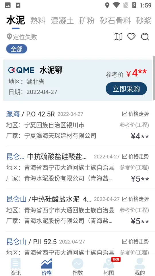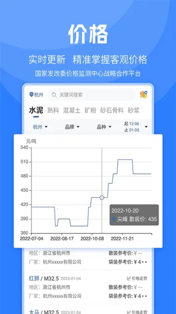 3、价格掌控:是国家发改委价格监测中心战略合作平台,能尽收水泥熟料、混凝土、矿粉、砂石骨料等价格走势,涨跌尽在掌握。