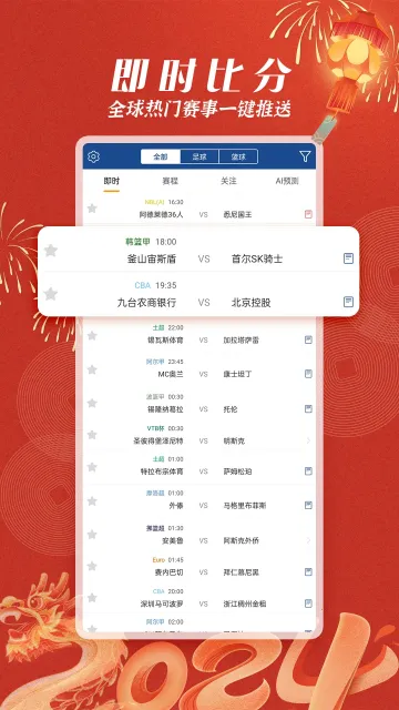 1. 提供即时比分数据更新,涵盖英超、法甲、德甲、中超等足球赛事,以及NBA、CBA等篮球赛事,满足不同体育爱好者需求。