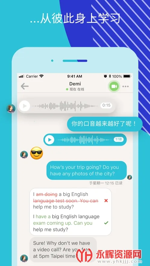 3. 无论身在何处,都能和老外一起练习听力、修正口语发音,学习旅程不再孤单。