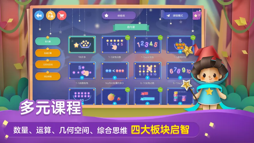 专业系统课程:四大板块全覆盖,打造多维度儿童数学启蒙教育体系,全面培养学龄前儿童的数学思维能力。