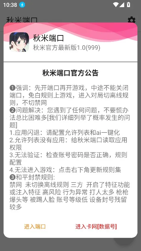 秋米端口是一款超棒的和平精英辅助工具!最新版本有不少更新亮点。它专为玩家设计,能提供丰富直装框架功能,快速启动游戏不在话下。还支持多个国际服,多平台适配,兼容安卓系统及模拟器,各种手游辅助环境都能轻松应对。自动清理痕迹功能超贴心,执行任务后自动清除日志和缓存,避免被封号。支持高并发,多用户能同时运行辅助。内部署多个节点,会根据网络状况自动切换接入口,模拟真实玩家网络行为降低封号风险,构建立体防御架构绕过安全监测。它传输极速稳定,采用隔离式运行机制减少被检测可能,智能自适应调节功能让游戏体验始终最佳。还能帮大家测试网络环境、切换网络接口,配合运行应用能大大增强游戏体验感,真的超实用!