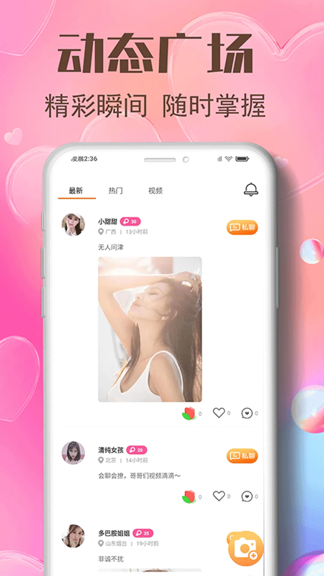 密聊视频交友软件能给你真实可靠的交友体验。它为你创造了一个超方便的交友空间,在这里可以自由交友。软件里所有伙伴都是真实的,通过实名认证,能放心展示自己魅力。它还设置了各种聊天话题,可自由选择参与。其功能丰富,在手机上交朋友很有趣,能一直与对方互动,了解更多优质用户。支持多种交友模式,在线社交丰富有趣,轻松就能聊天。通过实时关注他人动态,能随时了解信息,找到更多交流话题。能扩大朋友圈,找到有趣的灵魂。同城约会功能每日随机推荐同城在线对象,线上聊开心,线下可约见面。海量用户在线寻缘分,合眼缘就点赞,不合适可忽略,帮你找到最合适的那个Ta。有了它,交友不再有虚假担忧,轻松享受交友乐趣,快来下载吧!