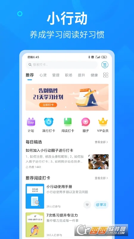 小行动app是一款超棒的学习践行互动式轻量级平台。它能有效解决企业培训机构在学习成长、持续训练监督坚持等方面的难题。功能超强大,有圈子共学,一键创建圈子邀请成员轻松管理;不受时间场地限制,随时随地学习;知识有序沉淀,互动式学习让员工在交流中成长;与岗位业务关联,针对性提升;学习打卡数据统计完善,节省人力成本。还有游戏化奖励设置,像趣味性拼图和刮刮卡玩法激励成员。精选国学哲学等经典文学内容,支持笔记和跟读。对个人来说,能帮我们养成各种好习惯,告别拖延症,比如设定日常小目标打卡,还能记录读书笔记、践行打卡等,多维度统计数据,见证自己的成长。无论是企业还是个人,用它都能收获满满,赶快下载体验吧!
