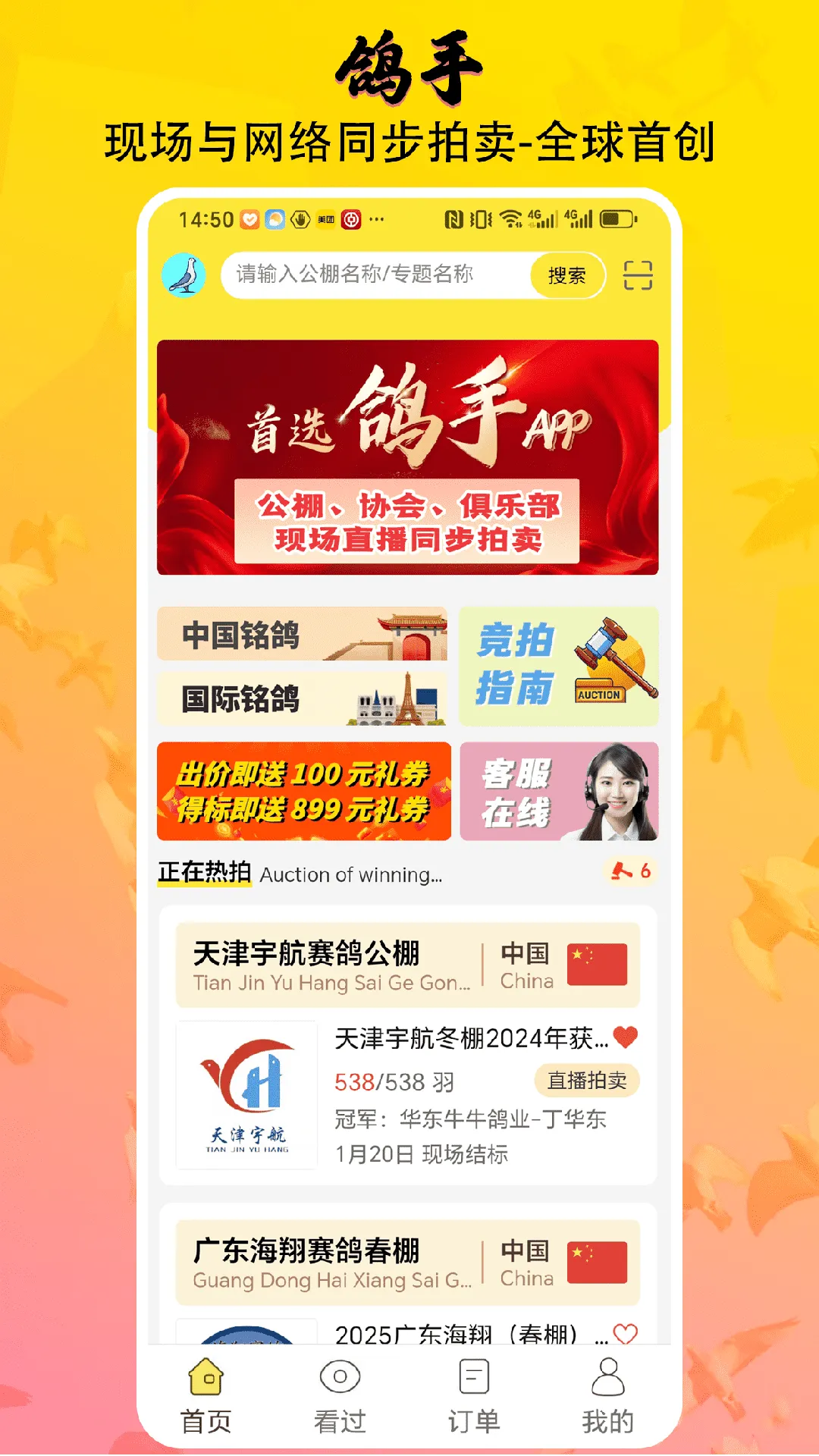 鸽手是深圳市鸽手科技有限公司为信鸽爱好者打造的生活分享及在线交易平台。有海量功能,可交流、交易、学知识、记生活、传文化。能全球赛鸽交易、多端同步拍卖、高清直播,快来下载体验。
