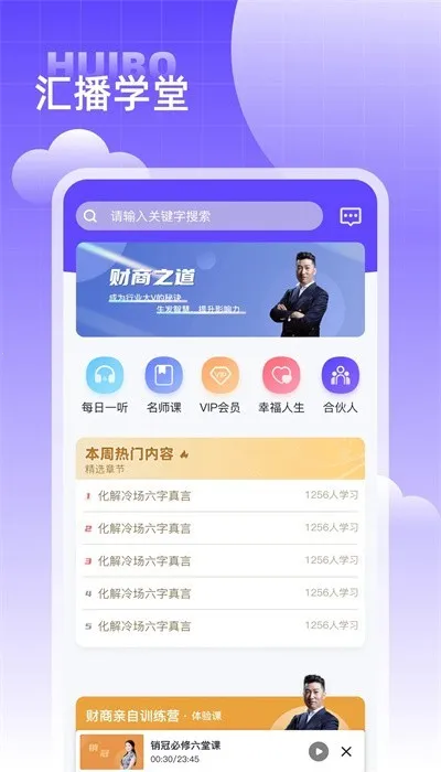 汇播学堂是专注课堂学习的在线教育 app,秉持财商教育宗旨。提供丰富课程资源、一对一指导,支持线上刷题答疑。具备多种学习方式,可自主管理进度、互动交流,还能缓存课程,助用户轻松高效提升财商。