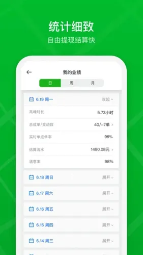 1. 奖励丰富:高峰有超多奖励,订单统计细致,结算周期自由选择。