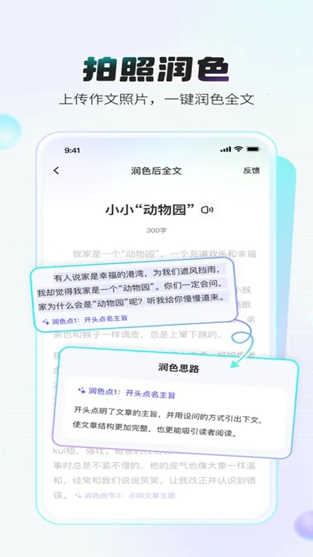 2. 基于强大AI能力,提供智能批改和全文润色服务,传授写作技巧。