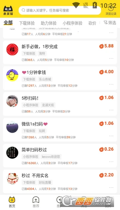 悬赏猫是一款能帮咱赚钱的APP。它任务类型超多,像投票、注册、下载、浏览这些简单任务,还有高价任务,完成就能赚佣金,收益满2元就能提现到微信或支付宝。邀请好友也能赚钱,邀请第一名有8888元现金奖励,还支持二级邀请提成。另外,你还能自己发布任务赚钱。它的商品资源丰富,覆盖主流电商平台,能一站式买到优质好物。有超级搜索功能,输入关键词就能快速查商品,还能对比同款。还有智能内容转换、热门标签推送、商品榜单、购物订单跟踪、地址管理等实用功能。在这购物能领优惠券,享受限时抢购、低价包邮福利。它安全可靠,下单在官方平台操作,人工精选任务,更新速度快,覆盖范围广,分类详细。想赚钱、想省钱购物的,都可以来试试悬赏猫。