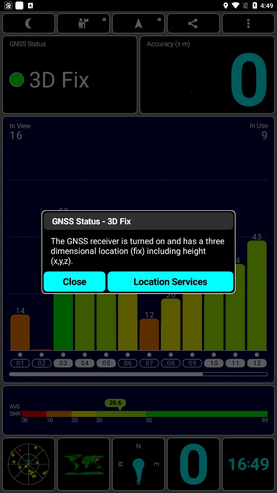 1. 全星系卫星监测:支持GPS、北斗等六大系统,圆形雷达图实时显示卫星位置与信号强度,直观区分各国卫星。