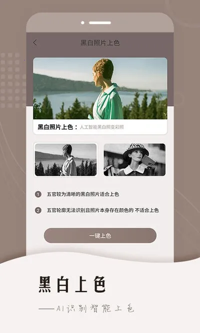 黑白照片一键上色,通过Ai精准还原符合场景的色彩,让珍贵的黑白照片重焕光彩。