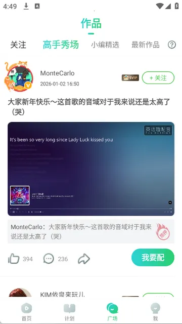 1、打开趣配音app,进入后在全部视频,推荐板块寻找喜欢的视频