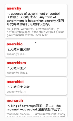 如果你正在寻找一款能帮助学习英语词根词缀的工具,那这款英语词根词缀字典PDF就太适合你啦!它能完整覆盖词根词缀,每种词根都有详细分析,还有独特的词根分析功能,能轻松分解单词,助你事半功倍。其界面极简,一切围绕学习展开。软件亮点多多,可根据词根分类快速记忆单词,还有权威例句。提供多种复习单词的方式,像速查表、识别测试、听力记忆、听写练习等。词典给出详细解释和例句,帮你理解含义与用法。通过学习词根词缀,能掌握更多词汇,提高阅读和写作能力。精心设计的检索功能,支持多种查找方式,让你快速找到想学内容。每个词条都有实用例句,结合艾宾浩斯遗忘曲线的记忆卡片,还有内置练习题,更能下载资料包Offline使用,随时随地学习,轻松攻克英语词根词缀学习难题!