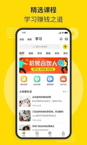 2、学习交流两不误:设有诸多精品课程供用户线上学习,聊天过程中还能发现新的人脉和商机。