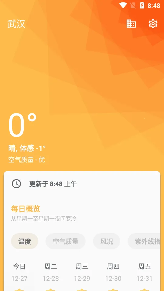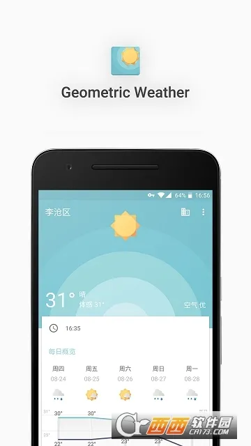 2. 界面简洁美观:拥有material design风格界面,遵守google设计规范又不循规蹈矩,UI美观灵动。根据天气情况交换主题背景,带来舒适的视觉享受,操作也十分方便。