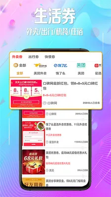 福利多样:新人免单,首注册可领取商品;每天早上九点更换积分换现金,每日签到、邀请好友、搜索商品等都可累计积分兑换现金红包;每日不定时推送红包,抢到即可提现或抵用;本地生活券如 kfc、滴滴、携程、驴妈妈、美团等优惠券应有尽有。