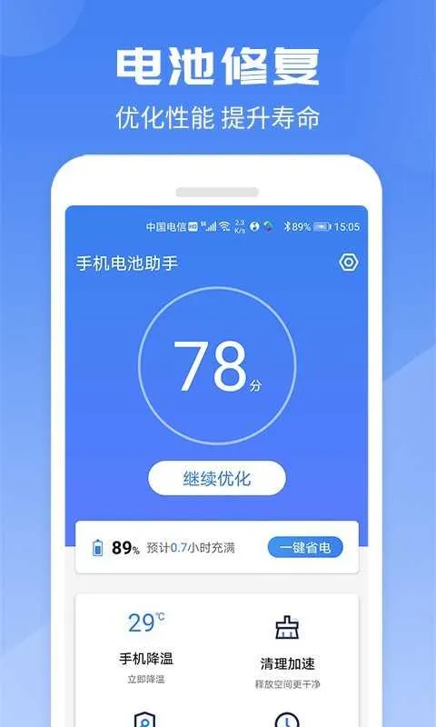 赛众电池助手2026是免费电池助手,能全面分析手机电池,充满电可提示,可声音设置保安全,一键清洁,还能延长电池寿命。有查看电池信息、一键清理、安全检测等特色功能。