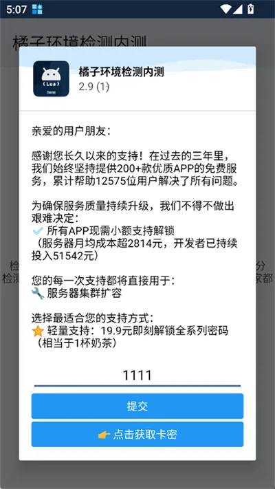 橘子环境检测工具是一款超棒的手机安全检测软件。它能深入扫描系统底层,精准识别Root权限、外挂程序、模拟器运行等20多项风险指标。比如Root状态深度检测,能扫描关键目录与SU二进制文件,揪出各种隐藏Root技术。智能外挂行为识别,内置1000种作弊特征库,实时监控违规操作。还能通过多维度分析精准识别虚拟机环境。一键扫描后自动生成可视化检测报告,用红黄绿标识问题项,包含硬件参数、系统状态与优化建议,支持分享与导出。获取卡密也不难,下载打开软件后点击获取密码,直接联系客服就能了解方式。它零误判,运用AI算法将误报率控制在0.1以下,纯本地隐私保护,数据零上传。每日更新特征库,动态对抗新作弊手段。有了它,能全方位保护手机安全,轻松解决环境异常问题,让你使用手机更安心、便捷。