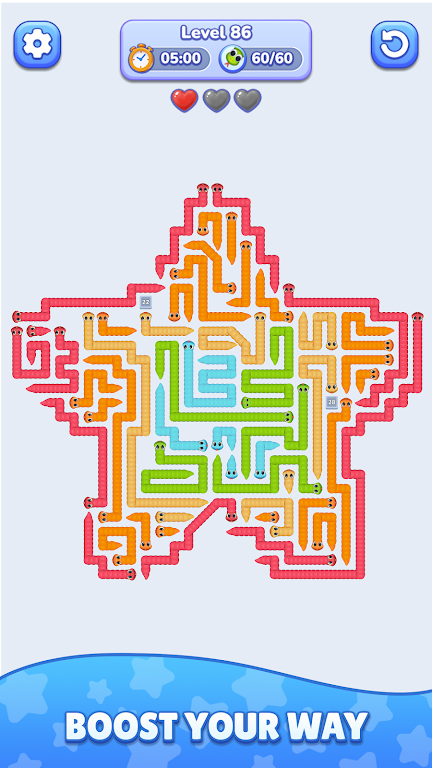 2. 玩法直观:通过点击屏幕控制蛇移动,计划前进方向,每个关卡目标明确,策略与反应能力很关键。