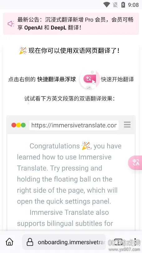 沉浸式翻译是一款出色的外文翻译软件。它支持超20种语言互译,依托先进AI技术,翻译准确可靠。特设沉浸式版块,开启悬浮窗权限就能轻松翻译外语内容。可保存翻译历史记录方便复习,多种语音引擎让口语翻译更准确流畅。还内置语言学习功能。能切换多种翻译引擎,满足不同习惯。不管是读名著、看新闻还是出国交流,它都能助力,是值得信赖的翻译伙伴,大大提升了沟通和学习效率。