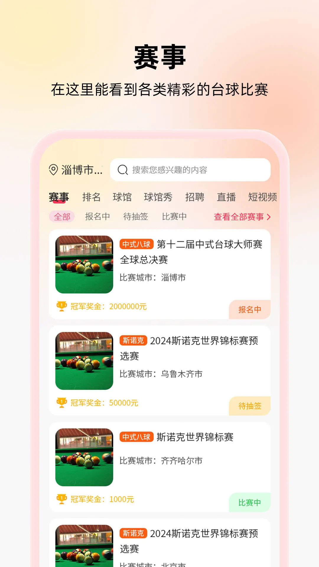 2. 丰富功能:赛事系统呈现精彩赛事,球馆功能展示周边球馆详情,短视频板块助提升球技,商城汇聚海量台球器材。
