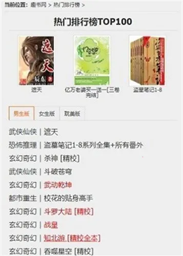2. 分类清晰:分为男生榜、女生榜和耽美版三个榜单,每本书还有配对的小说类型,能轻松找到受欢迎书籍及喜欢的小说种类。