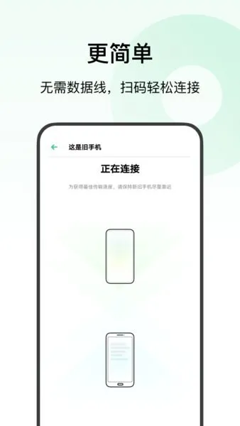3、操作简单便捷:扫一扫轻松连接,几步即可完成资料传输,无需复杂操作,新旧机清晰标识,设计精简体验流畅。