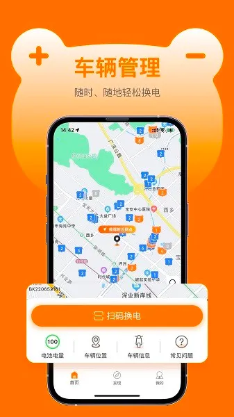 3. 换电超便捷:1分钟完成电池更换,满电续航50公里以上,支持90%以上新国标车型。智能定位导航,实时显示周边换电站,支持预约换电及路径导航,500米内必有换电柜。