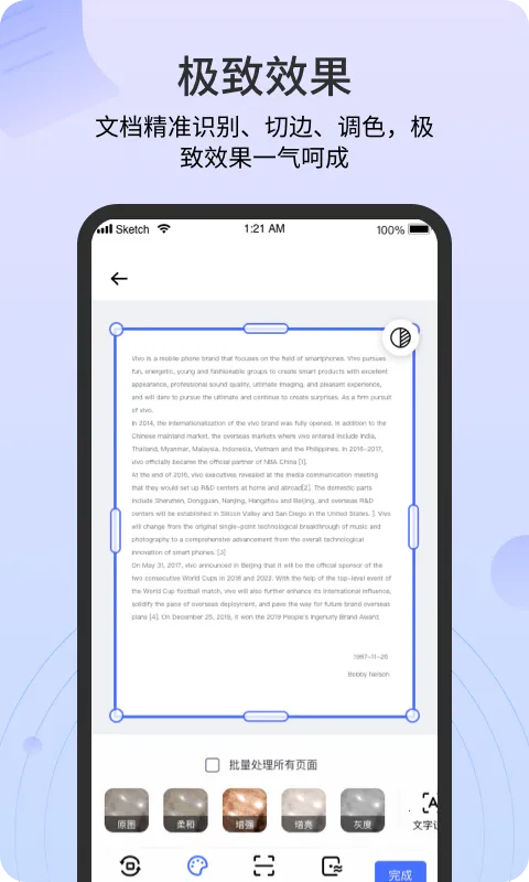 3、功能丰富实用:不仅能精准识别、裁切,还有多种滤镜和矫正工具,支持OCR文字识别、文字翻译等,简化工作量,提高效率。