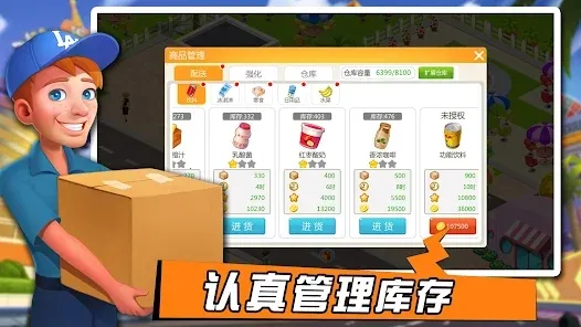 具备了收银员和配送员,基本工作就算告一段落,下一步需要学习如何补充货物,点击右下角的“货物”按钮,打开商品管理,点击“进货”并指定一名配送员即可。
