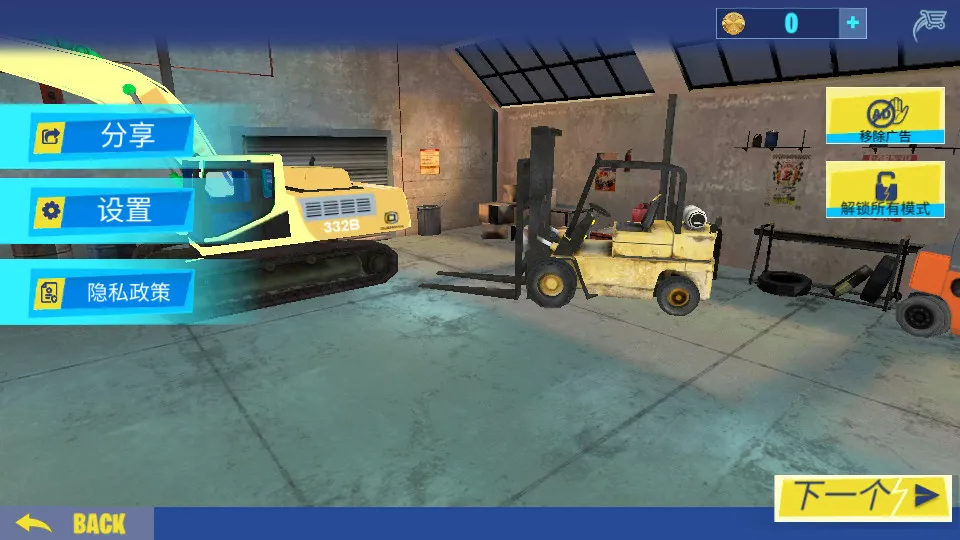 游戏玩法丰富,进入后先完成初始设置,从解锁的叉车模式开始,选择关卡和心仪叉车就能开启任务。操控油门、刹车、方向盘等控件,按要求完成目标积累经验,提升技能等级还能解锁更多模式。