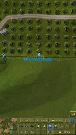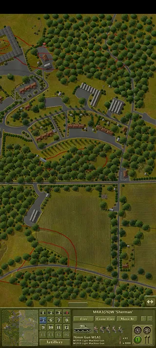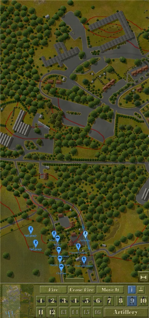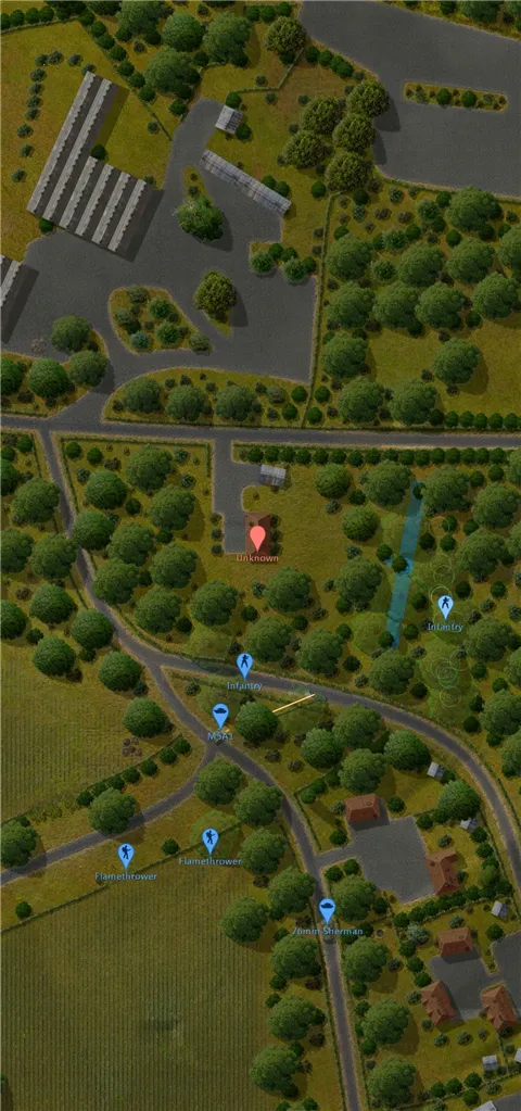 3、由图可见,这种情况非常危险。我方的余回部队被发现,但由于处于丛林复杂环境没有被交叉火力压制,我决定让他强行进攻,并派遣m5a1进行支援,地图最左端的机械步兵则进行大于回穿插,机械步兵团的位置被遮蔽物环绕,不用担心遭到火力打击。