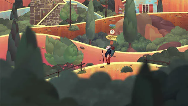随后将蓝色坡道向上拉伸,打通前往村庄的道路。抵达村口即进入新场景。再将黄色道路下拉,引老人步入旅馆——他拾级而上,在窗边长椅坐下。点击街头流浪歌手,一辆旧车缓缓驶来接走他,老人闭目,记忆再次浮现……