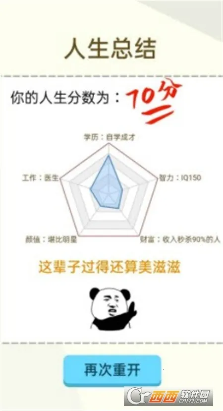 初始属性分配很关键,合理分配能帮你更容易达成目标。比如颜值、智商、体质、家境等属性,都得慎重考虑。选天赋也有讲究,橙色天赋厉害,紫色尚可,白色一般。而且游戏中能自由发挥,创造多样人生轨迹。要是你想拥有无限属性,破解版能让你更轻松地体验各种精彩人生,无需担忧属性不足,尽情享受独特人生旅程,快来试试吧!