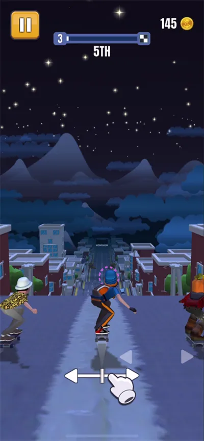 多样的游戏模式与场景:拥有无尽模式,采用无限生成关卡设计,障碍组合随距离递增复杂度,无终点设定让玩家不断突破自我纪录。游戏场景丰富,包括霓虹闪烁的主干道、狭窄曲折的小巷、绿意盎然的公园步道、惊险刺激的屋顶边缘等,每个场景都充满滑稽又致命的突发状况,动态障碍与场景互动性强。