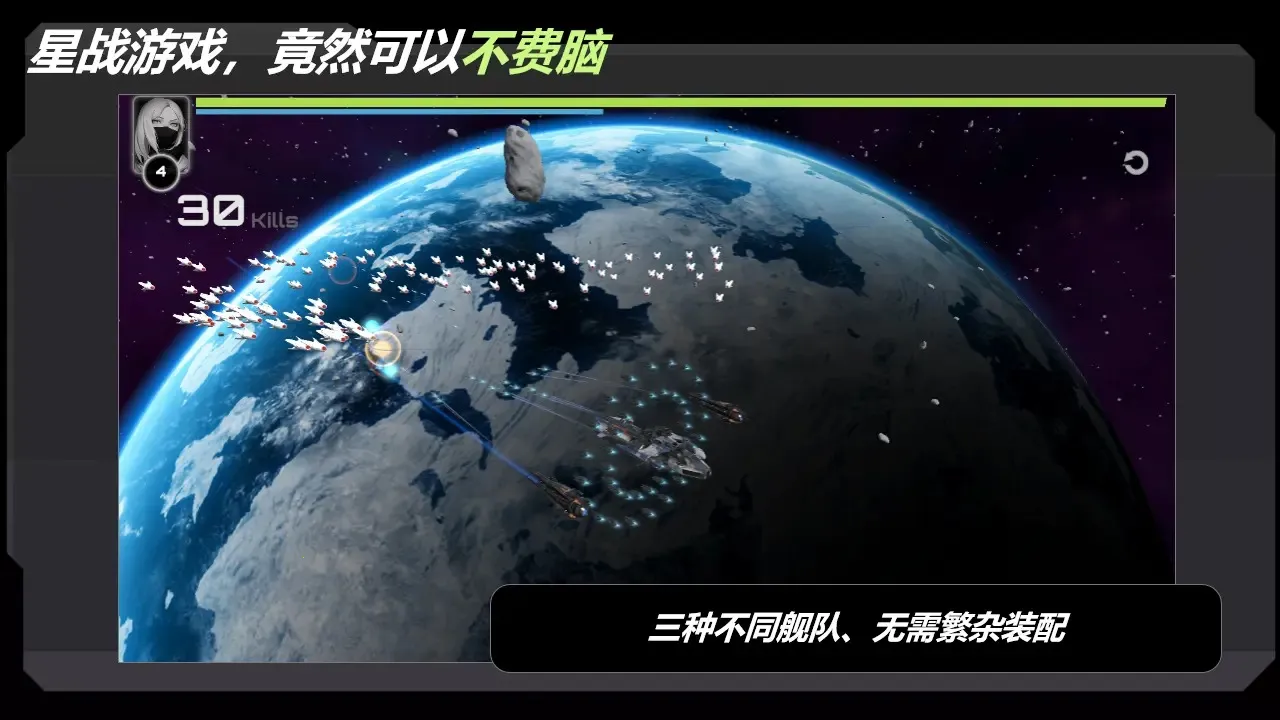 1. 可从三支不同舰队中挑选,一根手指就能实时控制整个舰队与无尽敌人厮杀。