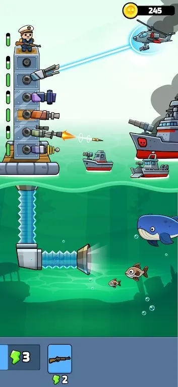 4. 丰富升级选项:在海洋中前进,解锁新武器,强化防御塔,提升伤害、扩大射程。