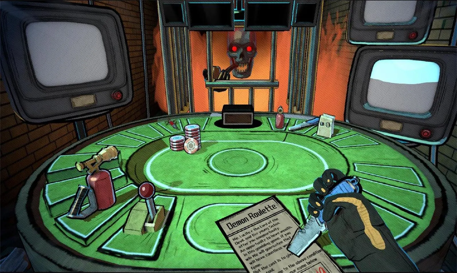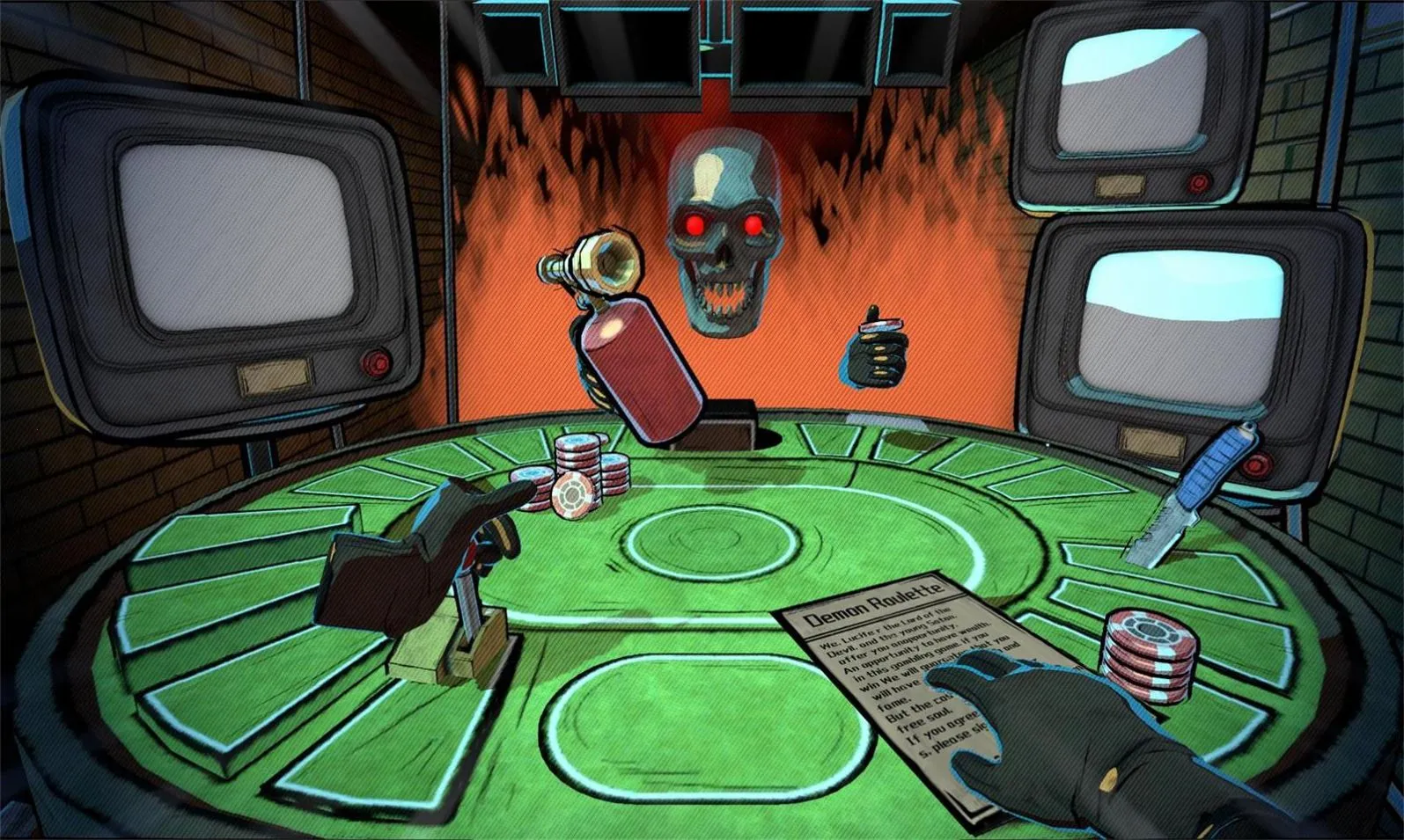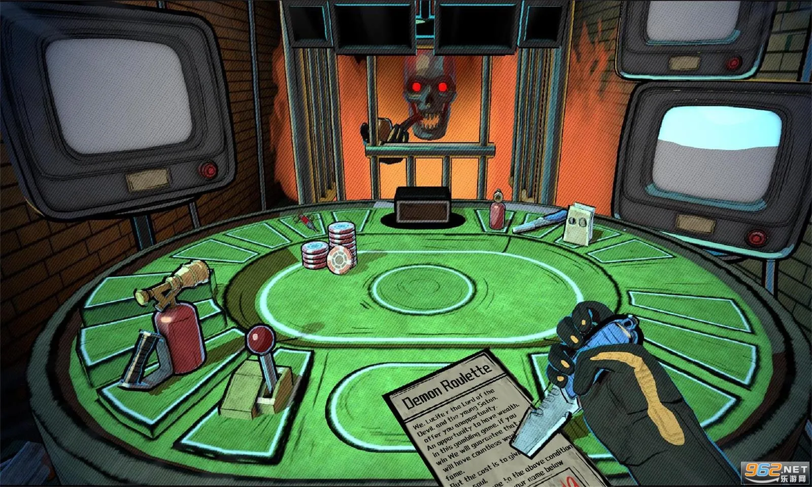 轮盘对决最新手机版是一款融合策略与运气的射击冒险游戏。玩家与盒子怪或恶魔进行轮盘赌局似的生死较量,有多种道具辅助,玩法自由度和随机性高,每局全新挑战,通过探索战斗收集资源提升能力。