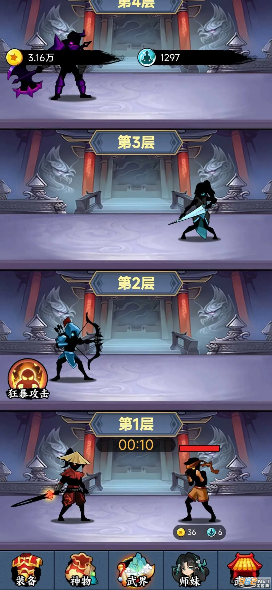 2. 玩法丰富多样,有放置过关斩将、即时战略玩法等,还有各类神器神物可解锁提升实力。