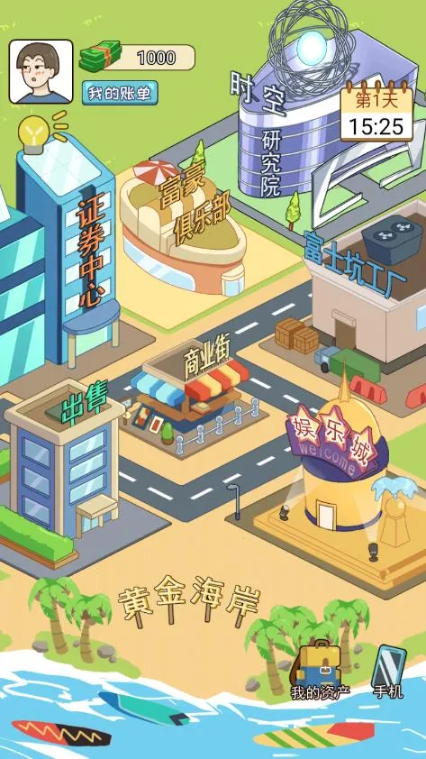 3. 多样赚钱玩法:设有黄金海岸钓鱼、逆风快递拆盲盒、娱乐城玩游戏、商业街扮乞丐等多种赚钱途径,增添游戏趣味性与策略性。