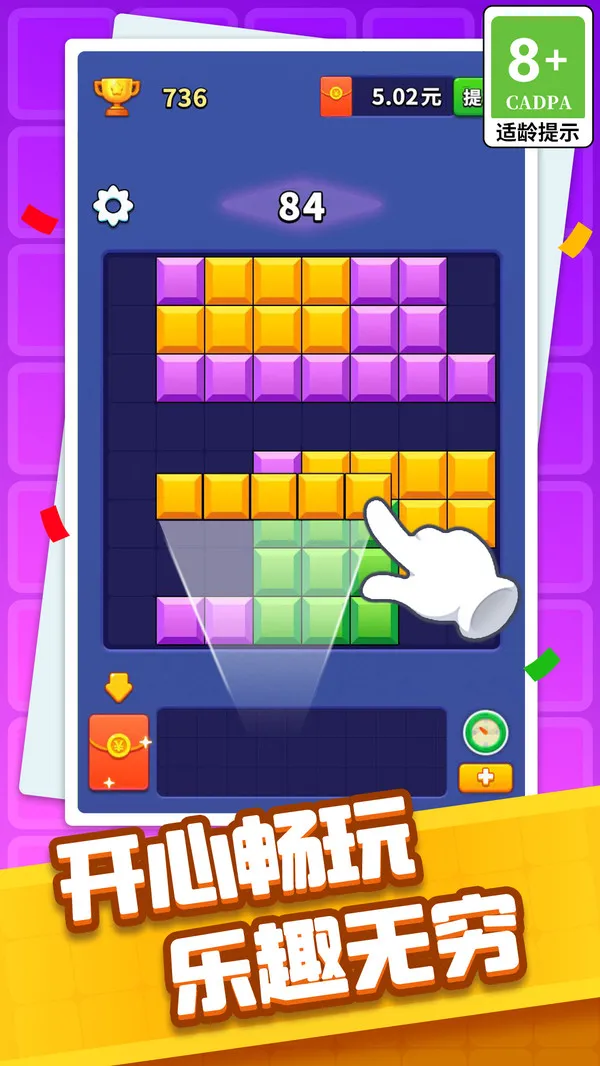 方块开心消是一款休闲闯关三消游戏,画风萌趣。在色彩明亮网格中消方块,完成关卡挑战。参与淘汰赛获积分解锁道具,操作简单,关卡难度递增,还有提现规则,兼具趣味益智与休闲解压等特点。